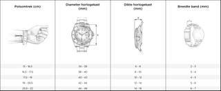 Meet altijd je pols op de plek waar je het horloge wilt dragen en vergelijk dit met de aanbevolen maten op de productpagina.
