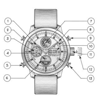 - Functies: Alarm, stopwatch, lichtgevende wijzers, chronograaf