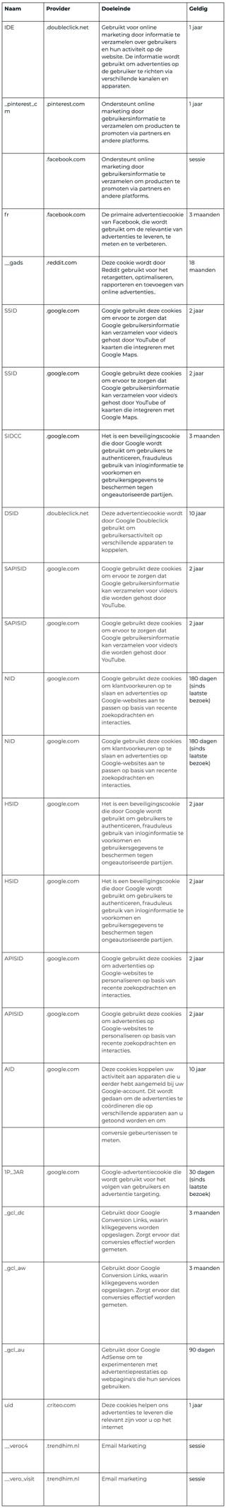 We gebruiken tracking cookies, statistische en technische cookies. Om je zo volledig mogelijk te informeren, hebben we de meeste cookies hieronder benoemd: